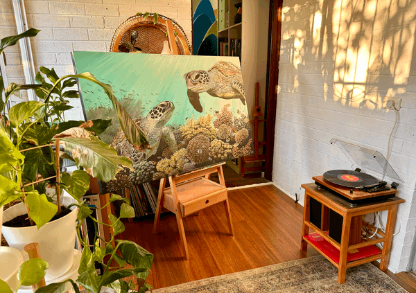 This one-of-a-kind artwork features two turtles gliding through a vibrant reef, capturing the beauty, depth, and harmony of the ocean. It has been professionally framed