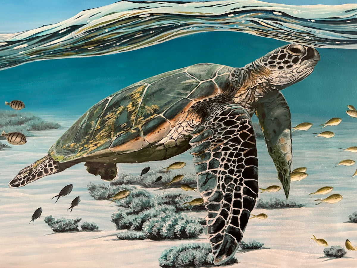 The original "Chunk the Sea Turtle" was painted for a client on a 6’4” Full Force surfboard shaped by Steve Barber on the Gold Coast, that was surfed all over Australia before a premature retirement to the shed. After languishing in storage for a few years it was the victim of a shed de-clutter and found its way onto my easel. It provided the perfect canvas for this painting of "Chunk the Sea Turtle". Chunk is a very special turtle, having survived an encounter with a Tiger Shark that left him missing a piece of his shell. He was named Chunk by the family who commissioned this painting in his honour to preserve forever his spirt of resilience and never giving in. Chunk helped to keep one more surfboard out landfill, and will help keep conservation efforts for sea turtles going with a small donation being made for every print sold.