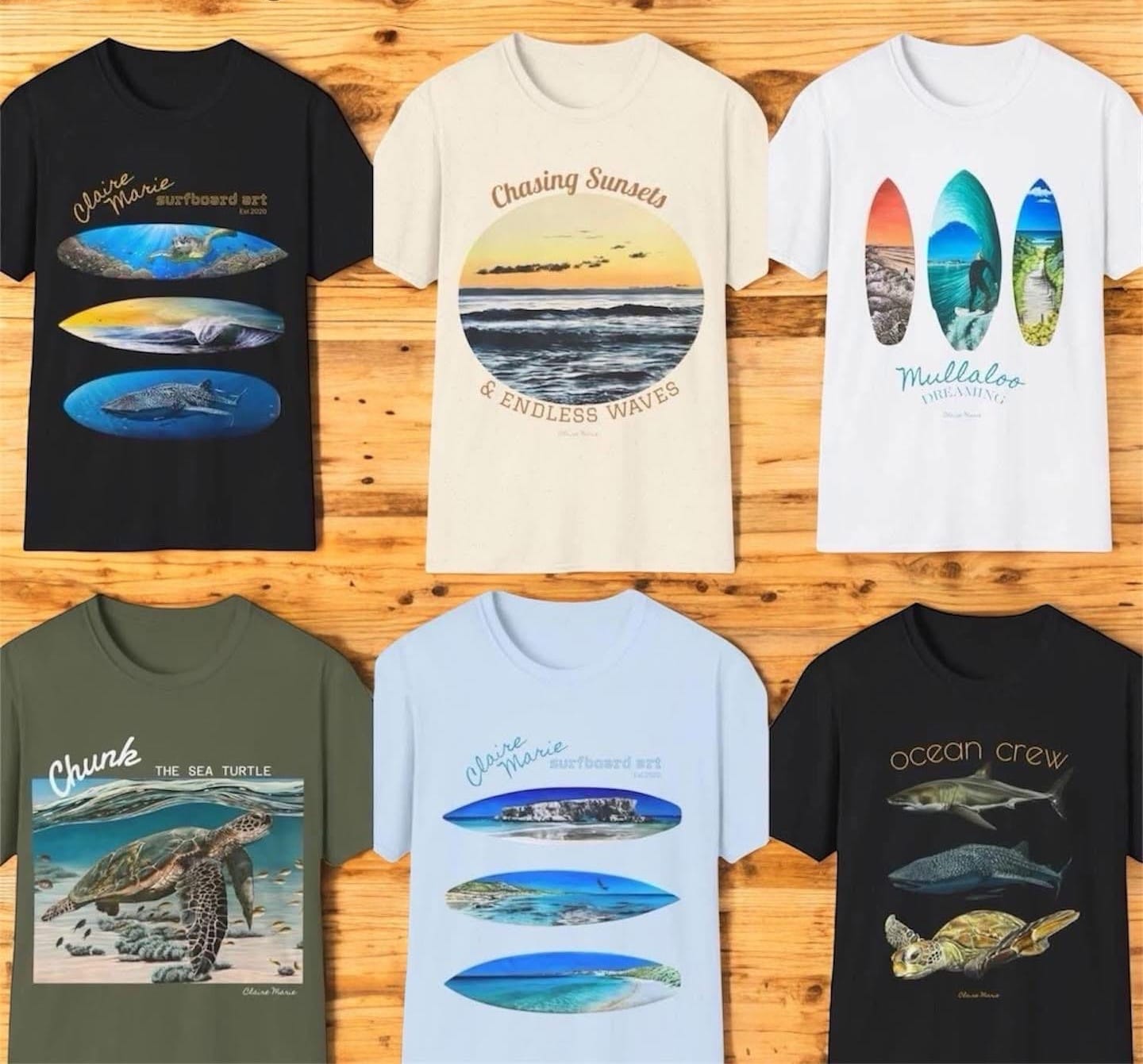 The Claire Marie Artist T-Shirt Collection is here — and it’s ready to bring a little coastal colour and positive vibes into your everyday life.